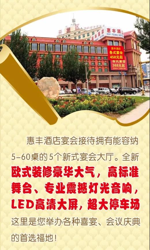 惠豐酒店多次被評(píng)選為鐵嶺最受消費(fèi)者信賴的企業(yè),以至誠(chéng)服務(wù)為新人婚宴、老人祝壽、寶寶滿月、企業(yè)會(huì)務(wù)慶典等多種需求都提供了專業(yè)一站式解決方案!
