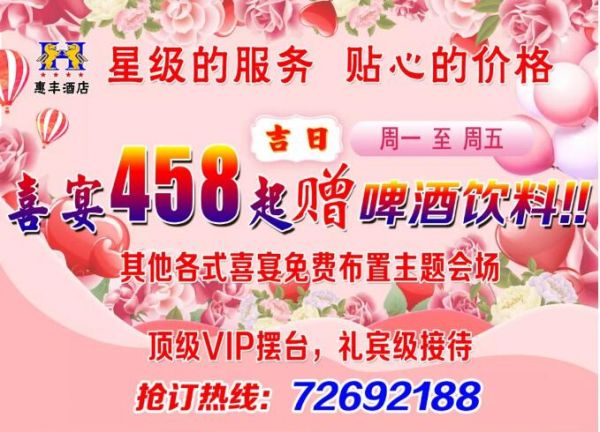 惠豐酒店宴會(huì)接待擁有能容納10-60桌的4個(gè)新式宴會(huì)大廳。全新歐式裝修豪華大氣,高標(biāo)準(zhǔn)舞臺(tái)、專業(yè)震撼燈光音響,高清大屏幕,超大免費(fèi)停車場(chǎng)。這里是您舉辦各種喜宴、會(huì)議慶典的首選福地!