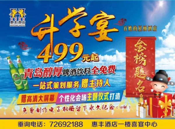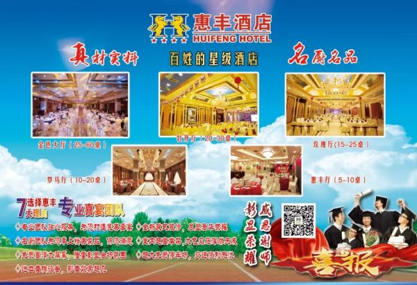 為慶賀莘莘學(xué)子升學(xué)之喜,惠豐酒店特推出升學(xué)喜宴。特價(jià)回饋,多重好禮驚喜等著您。同時(shí)也愿您前程似錦,鵬程萬里!
